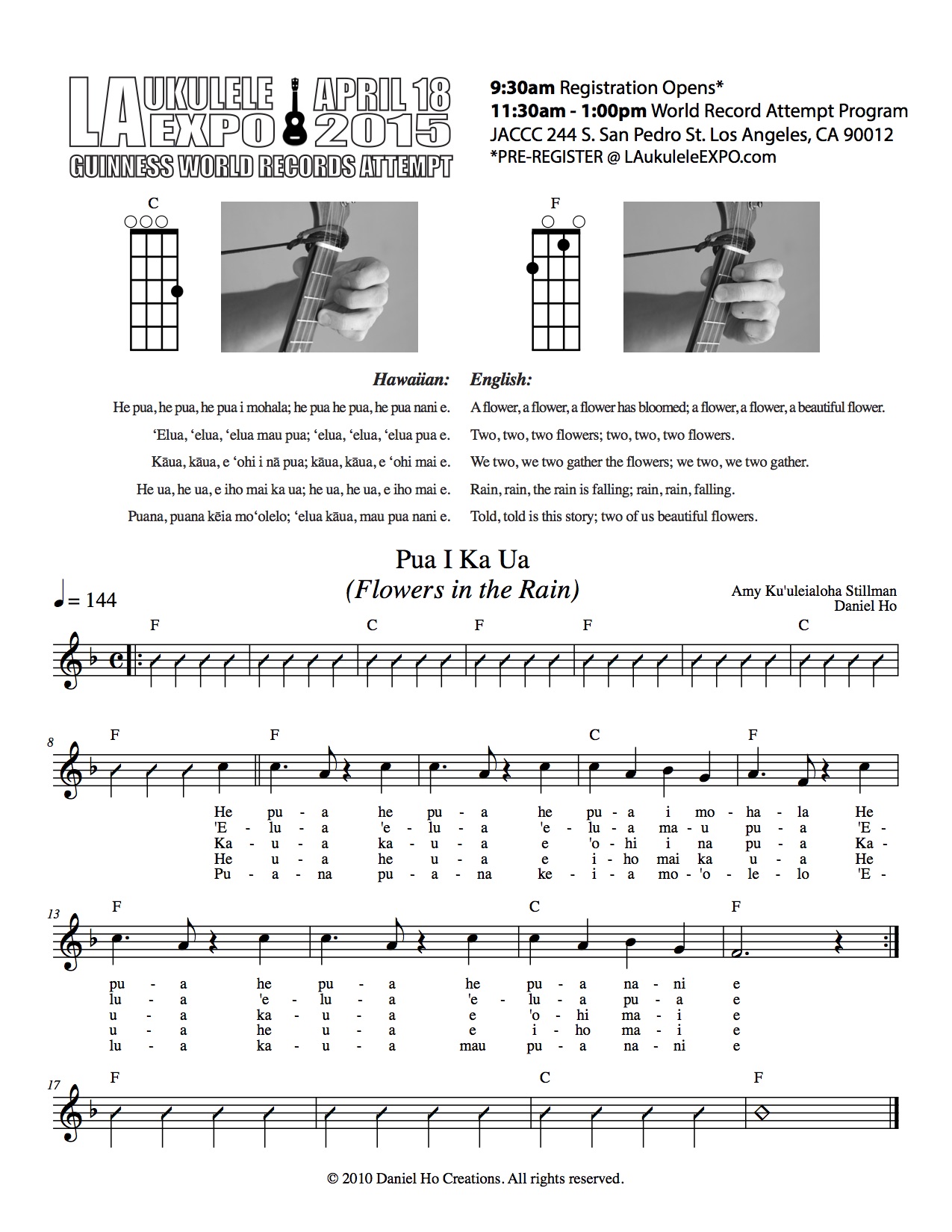 Registration for the play-along opens at 9:30am and the event itself will start at 11:30am. The best part is, you don’t even need to know how to play in order to participate – GRAMMY-winning artists Tia Carrere and Daniel Ho will be there to guide you through the chords of Pua I Ka Ua! For those of you who do know how to play, I’ve included a .jpg and a .pdf of the sheet music below.