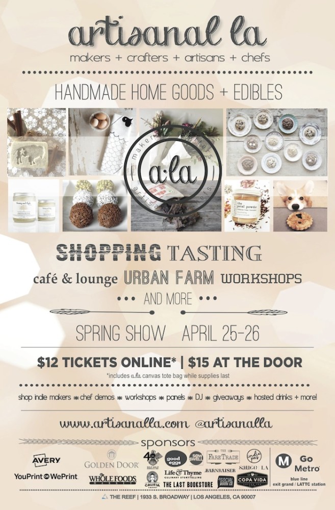 What: Artisanal LA, a “pop-up community event with weekend long seasonal shows and shops celebrating the city’s finest local, sustainable and handmade edibles,” is taking over The Reef downtown this weekend! The event features workshops (Hand Painted Leather Keychains!), panels (Beekeeping 101!) and 150+ vendors to shop from (Noms! Pretty things!).